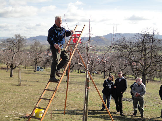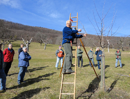 Bevor es an die Praxis ging, erläuterte der Kursleiter die elementare Bedeutung des Obstbaumschnitts. Gerade bei Jungbäumen ist dieser vorrangig wichtig, jedoch gilt, da die richtigen Schritte zu tun. Der in der Schweiz entwickelte ´Oeschberg-Schnitt´ ist dafür eine logische und leicht erlernbare Grundlage und derart erzogene und weitergepflegte Bäume bereiten seinem Besitzer auf Dauer Freude und reduzierten Aufwand.