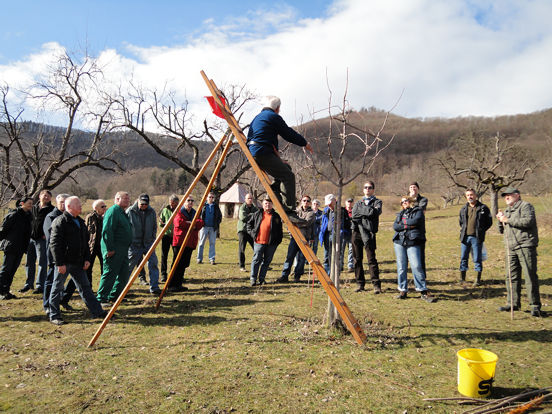 Nach der Einführung wurde diese Technik an verschiedenen, bereits so vorerzogenen Baumbeispielen, wie Apfel und Birne demonstriert und besprochen. Die Bedeutung von stabilem Baumaufbau, Kniffe der Schnitttechnik, u.a. am Beispiel Umkehrauge und begleitende Maßnahmen, wie Abbinden von künftigen Fruchttrieben und das Ausblenden bestimmter Knospen, waren zentrales Thema. Zahlreich gestellte Fragen erhielten dabei eine stets genügende und ebenso begründete Antwort.